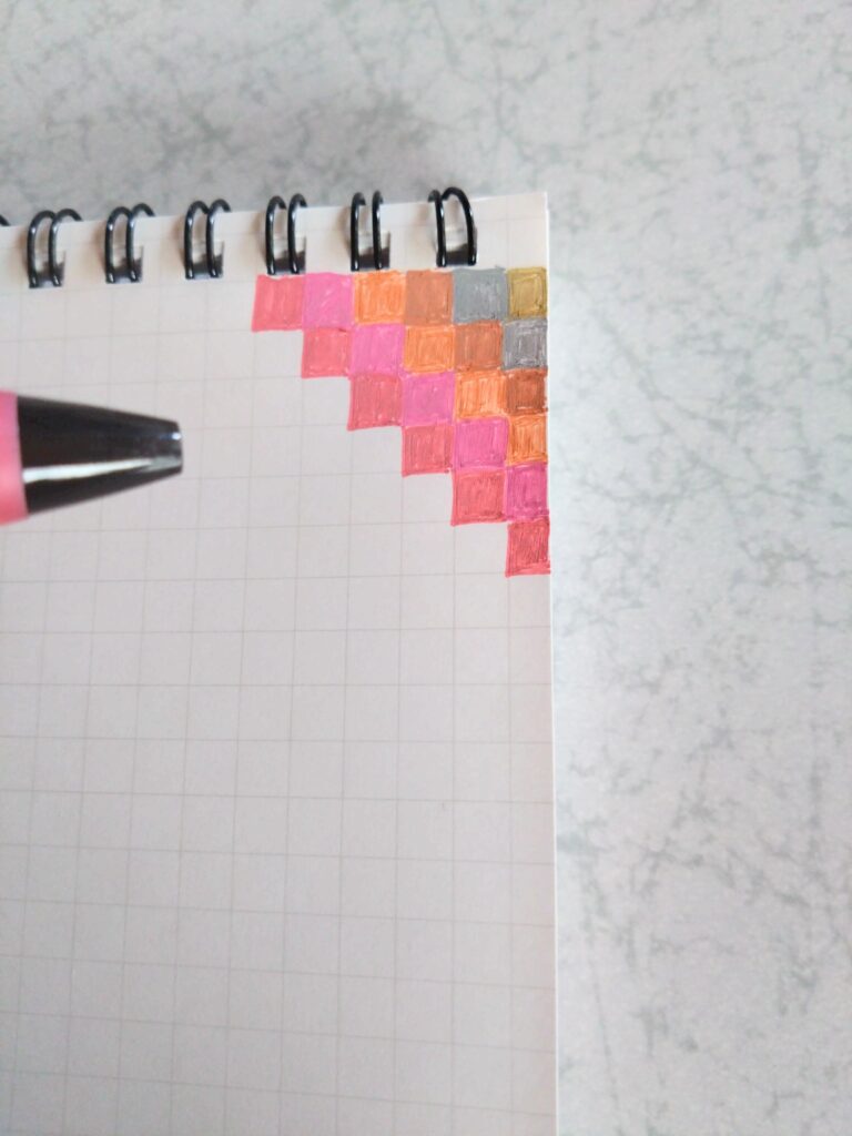 発色を確かめるため方眼ノートで塗り絵をし、5列目はシャイニーピンクで塗りつぶした。